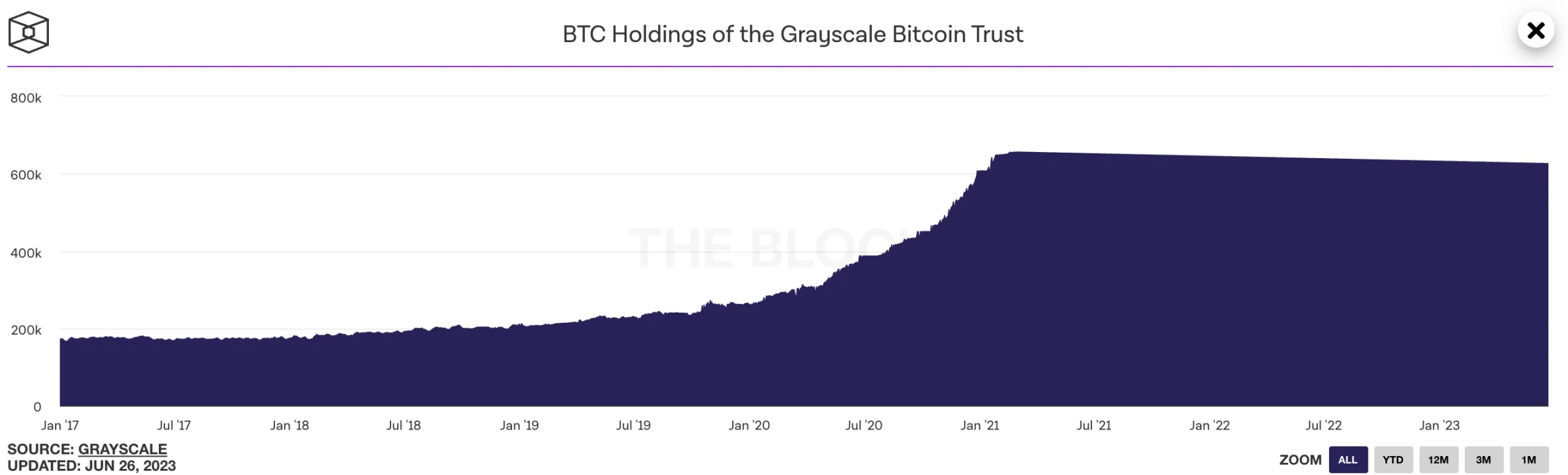 查看其图像,则更为震撼。在登顶之前,其持币数量犹如一座陡峭的山脉,不断攀升。由于其独特的机制,灰度只能买入、无法卖出,对比特币的现货市场施加了难以估量的影响。