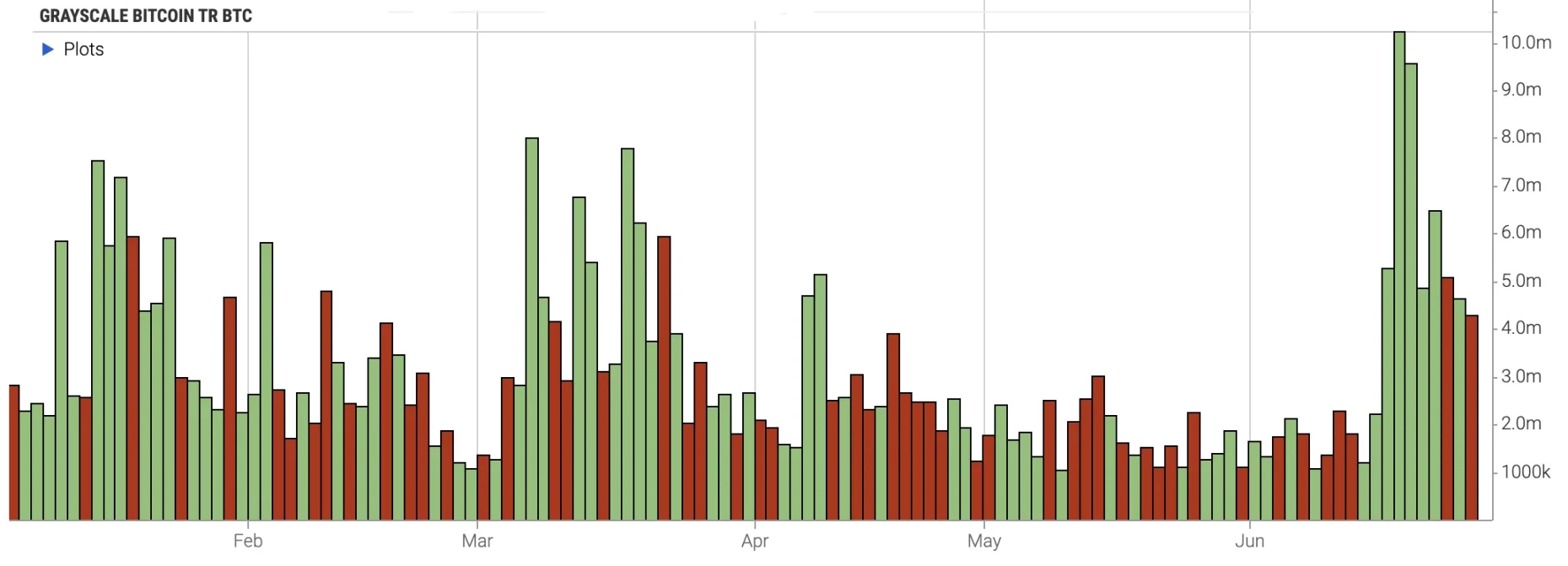 纳斯达克数据显示, 6 月 GBTC 的交易量达到了 6920 万美元,而在 5 月,这一数字仅为 3870 万美元,本月环比上涨 79% 。