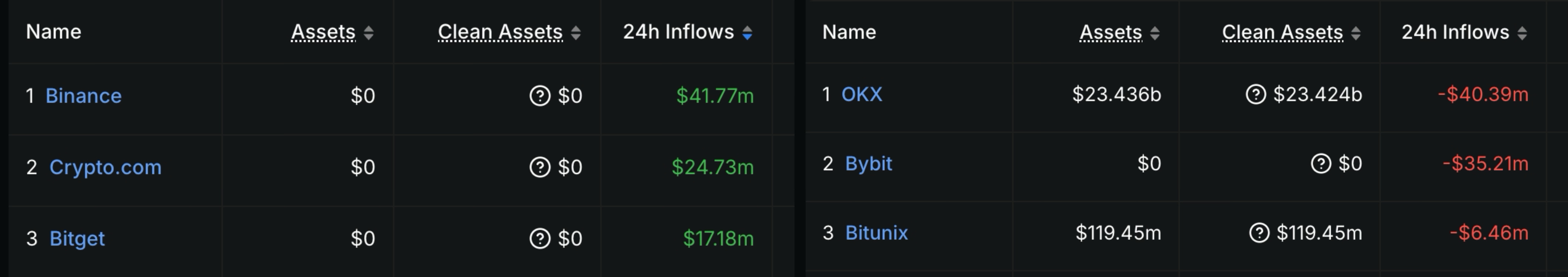 萌币网 消息,据 DeFiLlama 数据显示,过去 24 小时内资金净流入量 Top3 的中心化交易所(CEX)分别为:币安(4177 万美元)、Crypto.com(2473 万美元)、Bitget(1718 万美元)。24 小时资金净流出量 Top3 的 CEX 分别为 OKX(4039 万美元)、Bybit(3521 万美元)、Bitunix(646 万美元)。