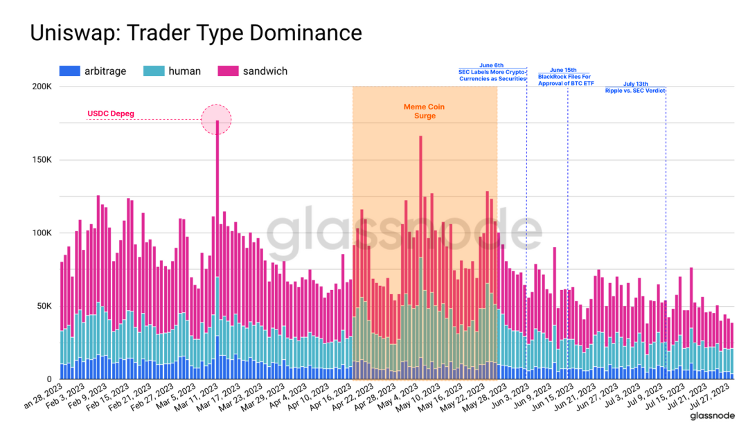 我们可以看到,在 USDC 脱钩或 Memecoin热潮等重大事件期间,手动交易者非常活跃。随着价格波动的增大和“目标交易者”的涌入,套利机器人和三明治机器人也活跃起来,在手动交易量上升期间,其活跃度增加了三倍。