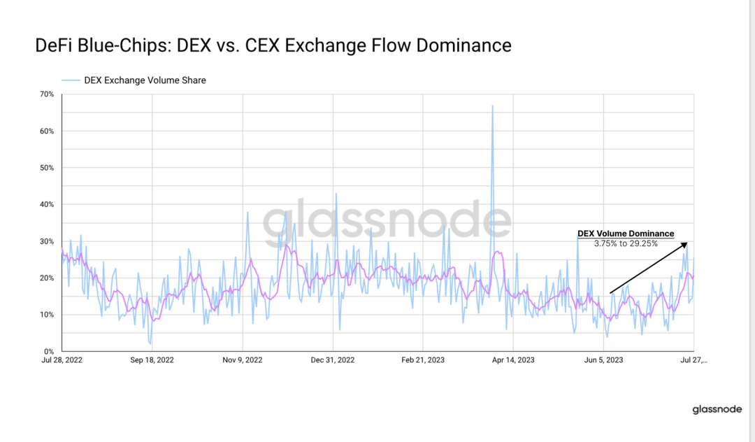 我们研究分析了前八名 DeFi Token 的 DEX 与 CEX 交易量,可以看出人们对 DEX 重新产生了兴趣。DEX 交易量的占比从 6 月初的 3.75% 增加到今天的 29.2%,接近 2022 年下半年的高点。