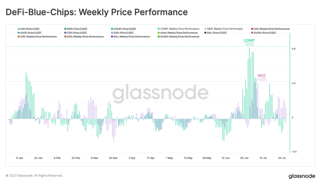 当我们分别观察排名前八的 DeFi Token,我们发现有两种 Token 脱颖而出,成为这一上升趋势的主要驱动力:MKR 和 COMP。仔细观察,我们可以发现,其表现很可能与最近新推出项目的基本面密切相关,而不是整个市场的发展。