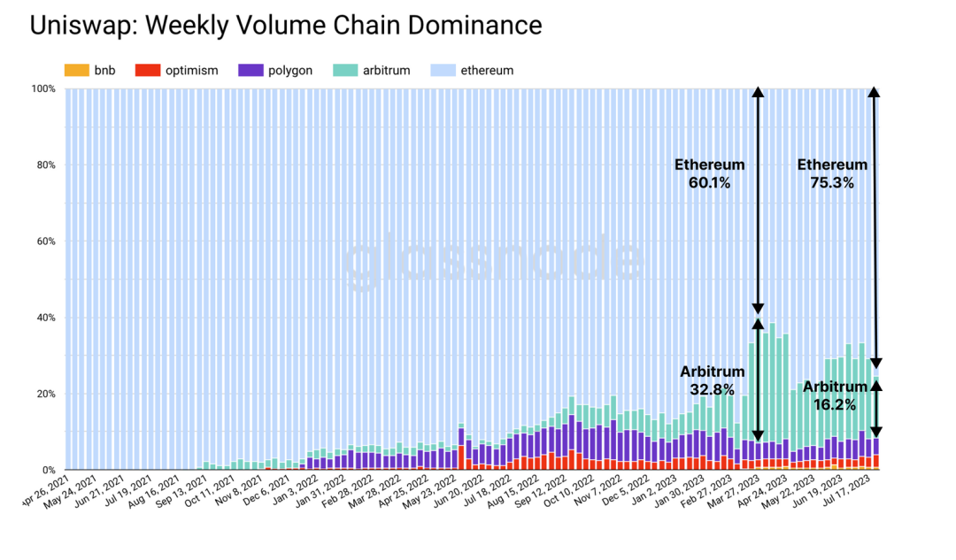 图7:Uniswap:各条链的周交易额占比