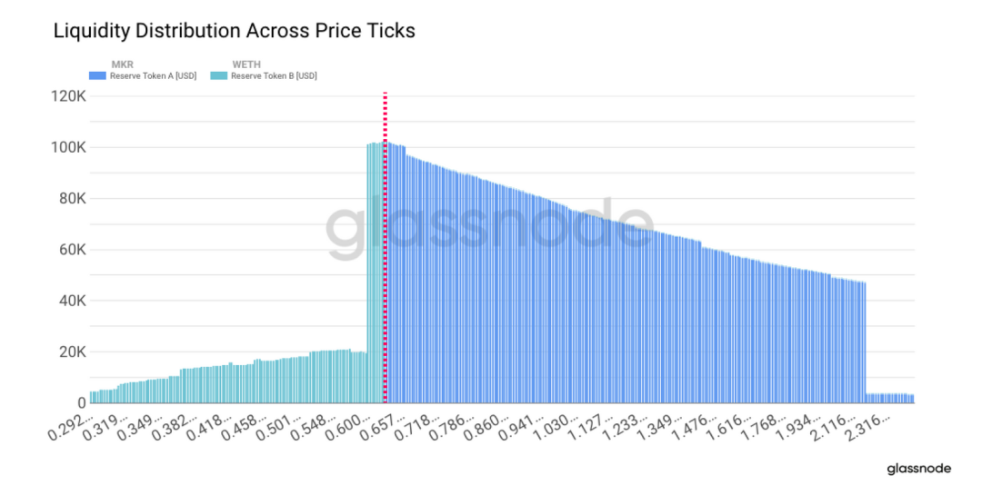 自 MakerDAO 回购计划宣布以来,Uniswap V3 上 Maker 最成功的流动性Pool是 MKR/WETH 池,其流动性显著增加。