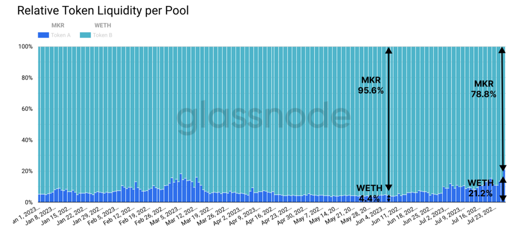 在研究该流动性pool的构成后,我们可以清楚地看到 WETH 的占比有所增加,目前占总量的 21.2%。这说明交易者越来越多地用 WETH 购买 MKR ,也就是说自 6 月初以来市场对 MKR 的需求明显上升。