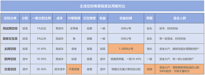 - 测试网空投:这类空投分配比例较少,需要大量时间和精力,周期较长;