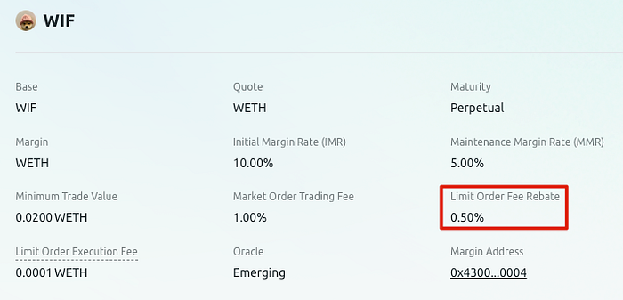 而在 oAMM,交易费分成则是在订单被吃掉时,直接返还到用户的保证金账户里。以 BTC-USDB-PERP 为例,目前分成比例为交易金额的 0.01%;而风险相对较高的 MEME Coin WIF-WETH-PERP,则高达 0.5%。 这可能是目前行业里衍生品赛道最高的返佣比例。