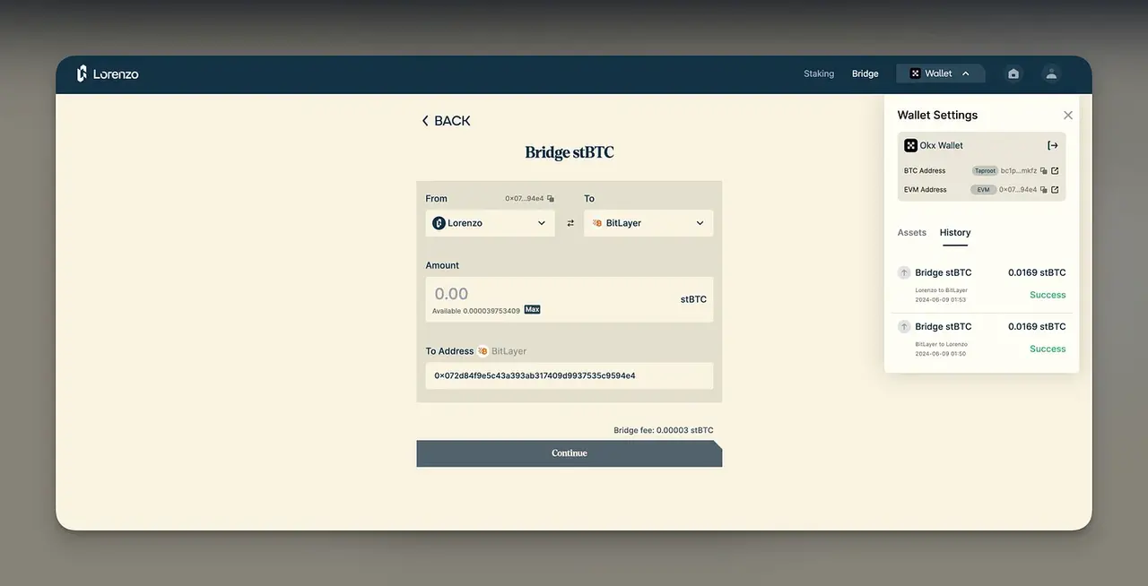1. 从 Lorenzo 官网点击 "Bridge stBTC",输入想要跨链到 Bitlayer 的 stBTC 数量