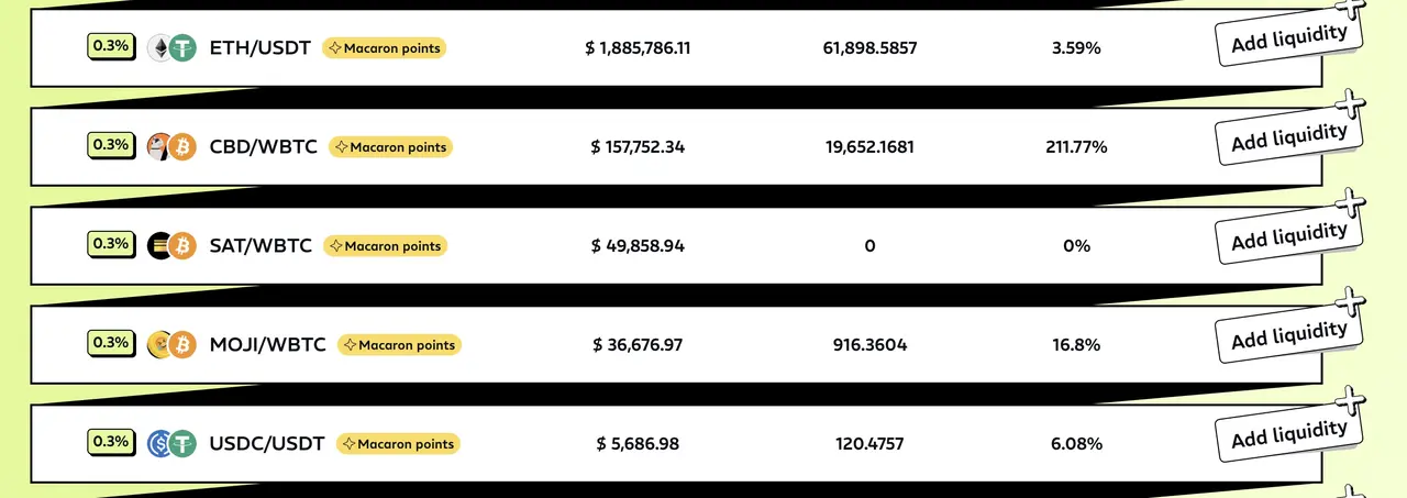 另外,Macaron 目前正在进行流动性池交易大赛,用户在借出 SAT 后,可以在 Macaron 的流动性池进行兑换或提供流动性,获得更高的收益潜力。这一交互行为同样可以获得来自 Macaron 所提供的额外积分加成作为奖励。