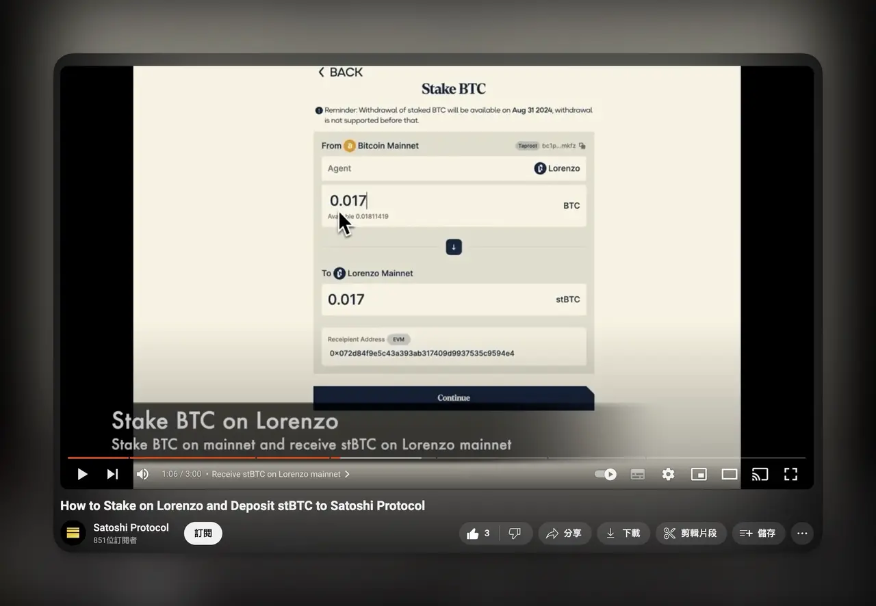 具体操作流程,可参考项目官方发布的视频指南:How to Stake on Lorenzo and Deposit stBTC to Satoshi Protocol