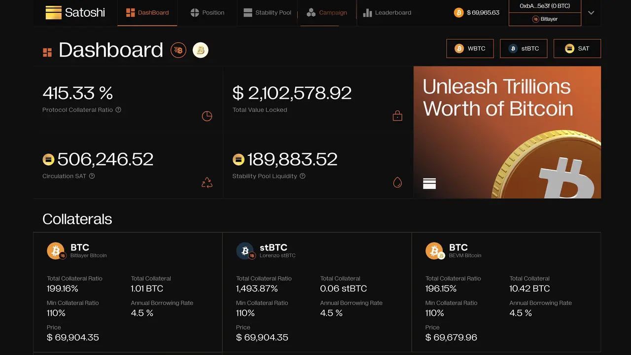 Bitlayer 生态中的头部 DEX,Macaron 也已经有 SAT-BTC 的流动池,让用户可以在 Macaron 上交易 SAT、BTC 并获得额外的积分加成,该积分可以获得 Macaron 未来的代币空投。随着整合更多 LSD、DeFi 协议,将拓展更多 SAT 的使用场景及合作生态,为 BTCFi 打造更坚实的基础设施。Satoshi Protocol :
