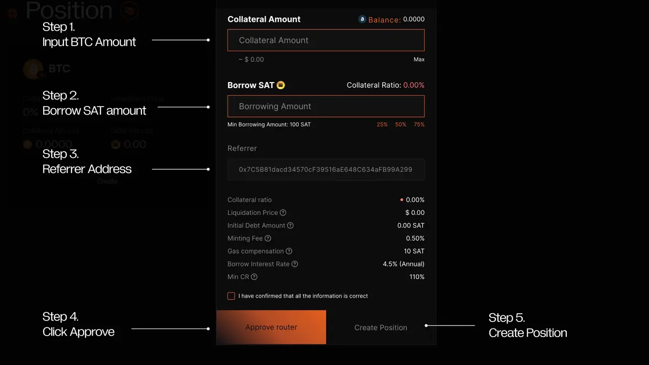 Step 4: 输入作为抵押品的 stBTC 数量以及需要借出的 SAT ( 至少借出 100 SAT )