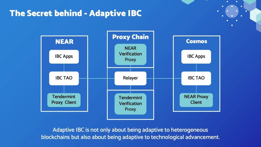基于此,Adoptive IBC 突破了异构链 IBC 的可扩展性瓶颈,不仅可以自适应 NEAR 、Polkadot、Ethereum 等各种不同共识机制的区块链。还可以适应验证技术的快速发展。如果未来 Cosmos 采用了聚合签名,或者 NEAR 支持了 ED25519 签名的 precompile,届时在 NEAR 上面直接验证的成本会大幅降低。就可以把代理客户端升级成真正的轻客户端,废弃对应的验证代理。一旦 ZK 跨链技术成熟,还可以把代理客户端换成 ZK验证器,把验证代理换成ZK证明器。这些升级通过治理完成,对上层应用完全透明。
