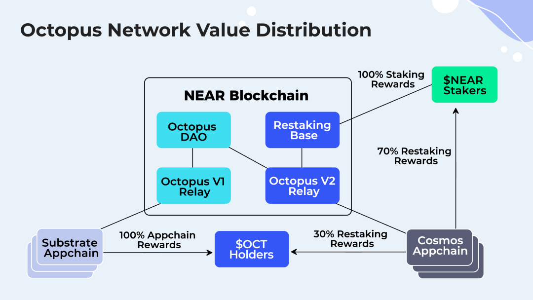 Octopus 2.0 的 $NEAR Restaking 机制可以让 $NEAR 持有人在为 NEAR Protocol 做质押的同时,也可以为 Ottochain 甚至更多的应用链做质押。所以除了获得一份 $NEAR 的质押奖励,还可以再获得一份 Ottochain 发放的 $OCT 作为 Restaking 的奖励。