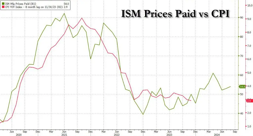 隔夜先后公布的两个PMI数据引爆了市场对美国经济的担忧。ISM制造业PMI中,新订单指数44.6,为2023年6月以来最糟,7月前值47.4;库存指数为50.3,较上月大涨5.8个点,7月前值44.5;制造商的支付价格指数从7月的52.9上升至54。Markit制造业PMI和ISM分项数据趋同,并传递三大重磅信号: