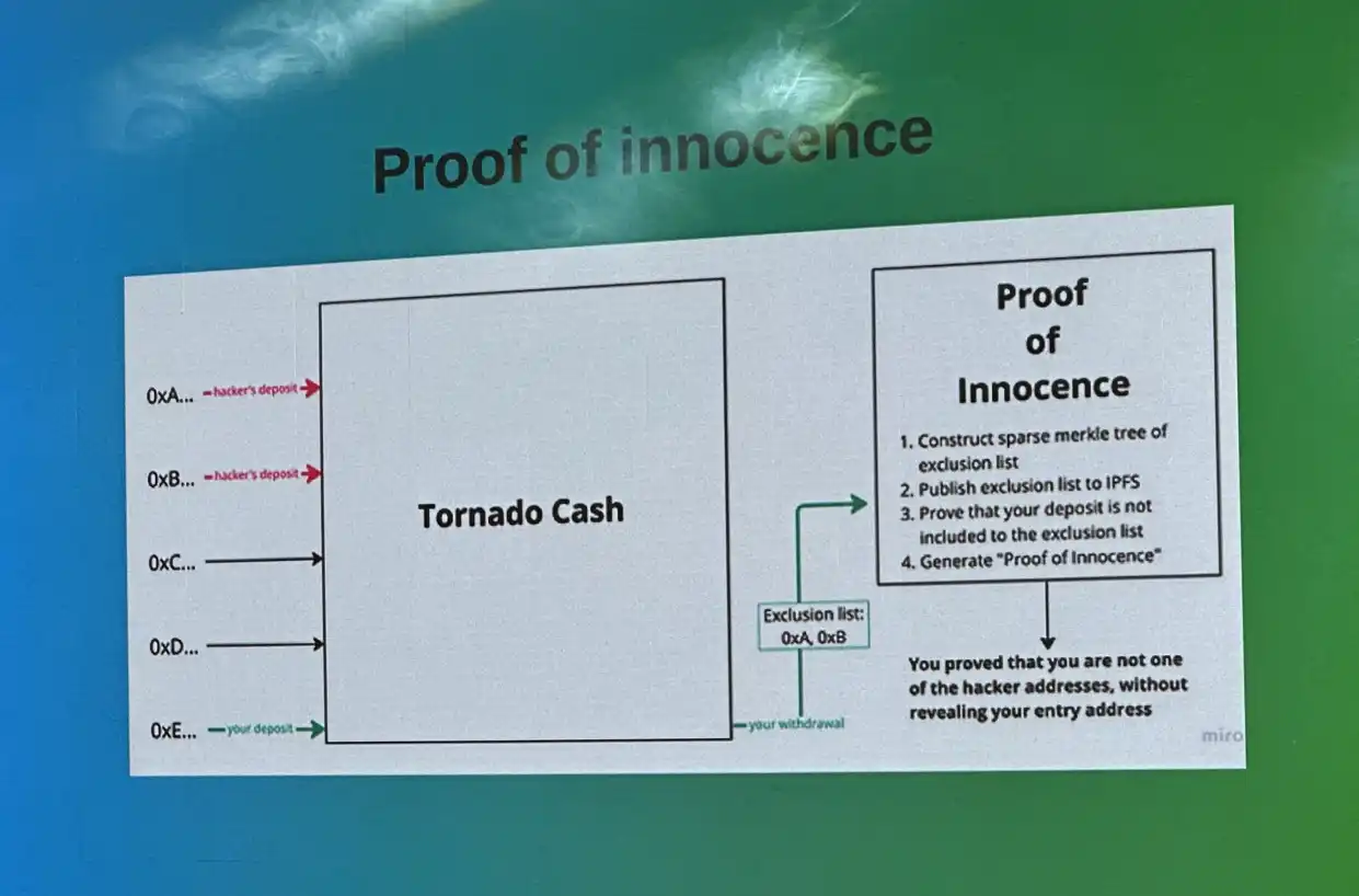 当然,还可以像 V 神演讲中所指的那样,直接构建 exclusion list 默克尔树,相当于给 Tornado 协议加入了一个黑名单机制。 正常用户的入金不在 list 之内就可以生成无辜证明进而正常使用 Tornado,反之则恰恰相反。 加黑名单虽然有效,但有中心化风险,个人认为阻挠出入金私钥不一致的交易更有意义一些;9/n