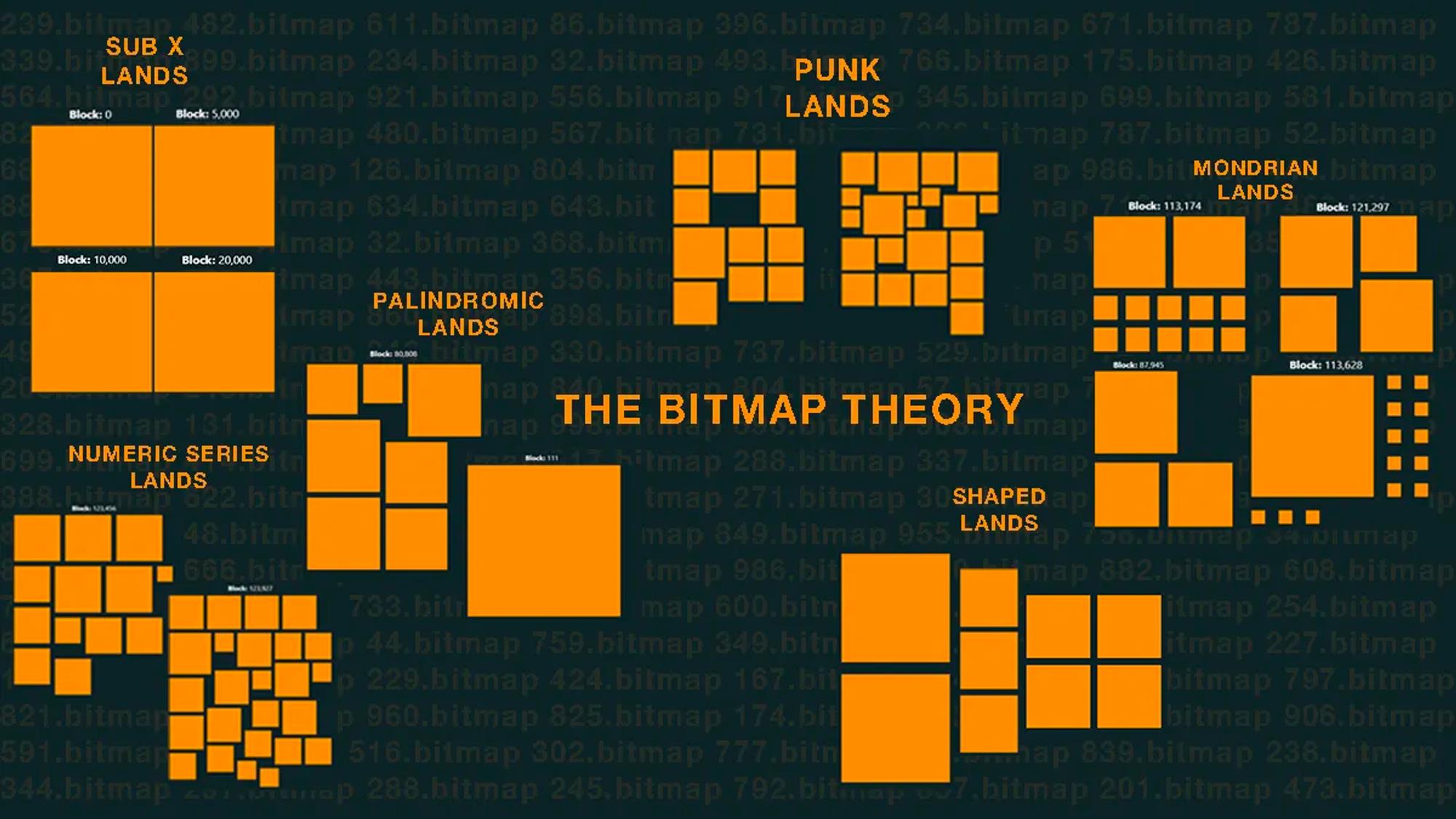位图理论(Bitmap theory)由推特用户@blockamoto在2023年6月13日提出。这一理论将比特币区块中的每笔交易输入映射成地块(Parcel),形成一个街区或区域(District)。不同交易输入的大小差异导致映射出的地块大小也不同。