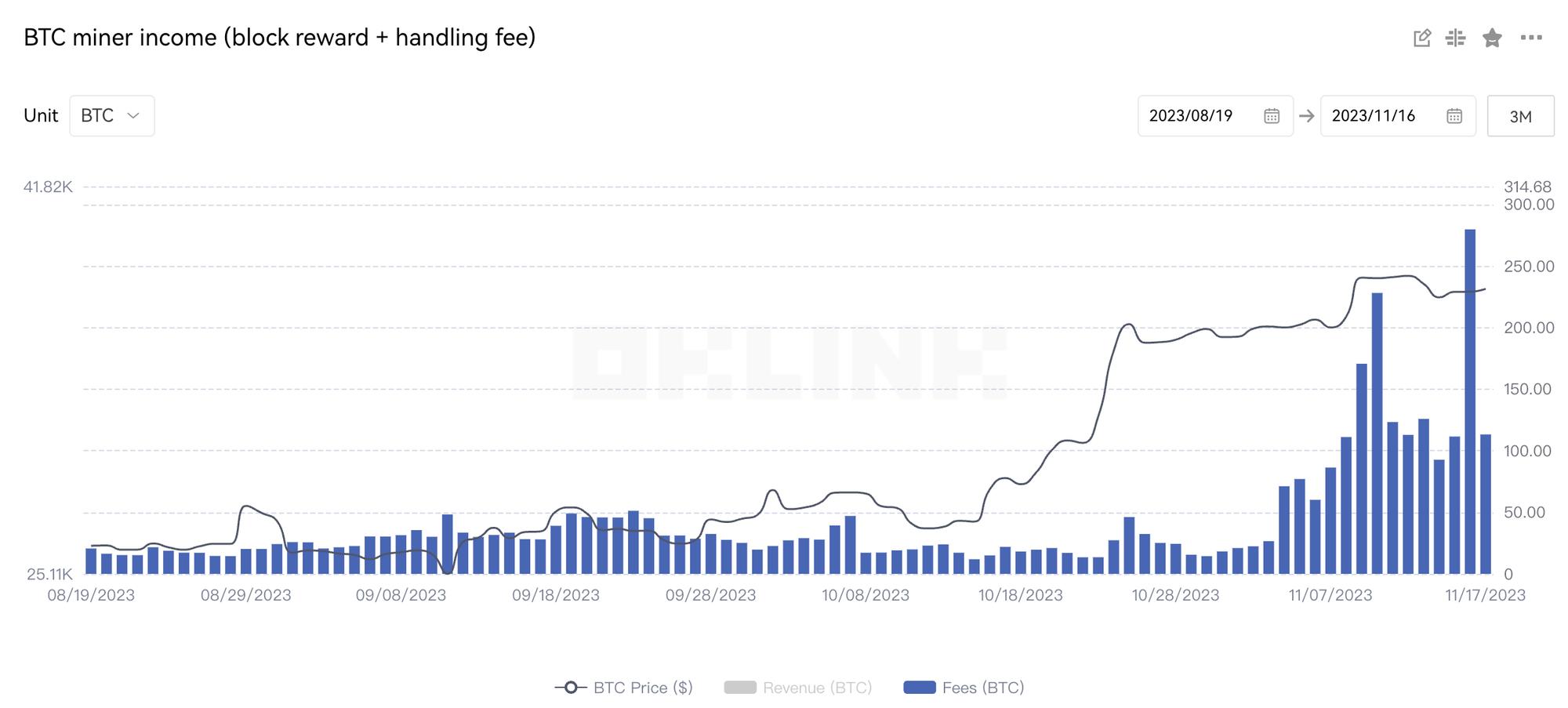 而在矿工利益方面,近期的数据表明,随着像Ordinals和Atomicals这样的项目的兴起,比特币铭文市场正在经历一场空前的繁荣。根据oklink链上大师的数据,在过去三个月中,比特币矿工的收入有显著提高,特别是在11月,链上手续费贡献的占比从8月19日的2.4%上升至11月16日的23.46%。这一增长主要得益于Ordinals交易对的引入。这表明比特币铭文市场的发展显著提高了矿工手续费收入的比例。预计到2024年4月的比特币减产时,这一比例可能达到50%。