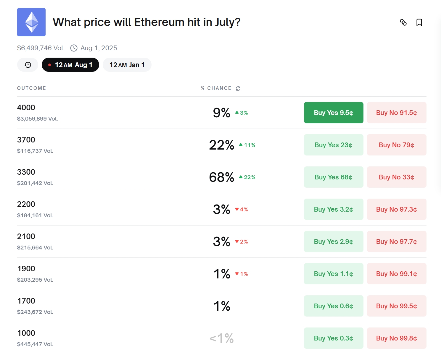 萌币网 消息,Polymarket 官网显示,市场押注 7 月 ETH 价格超 3300 美元的概率为 99%,其中押注超 3300 美元的概率为 68%,押注超 3700 美元的概率为 23%,押注超 4000 美元的概率超 9%。目前该预测市场交易额超 650 万美元。