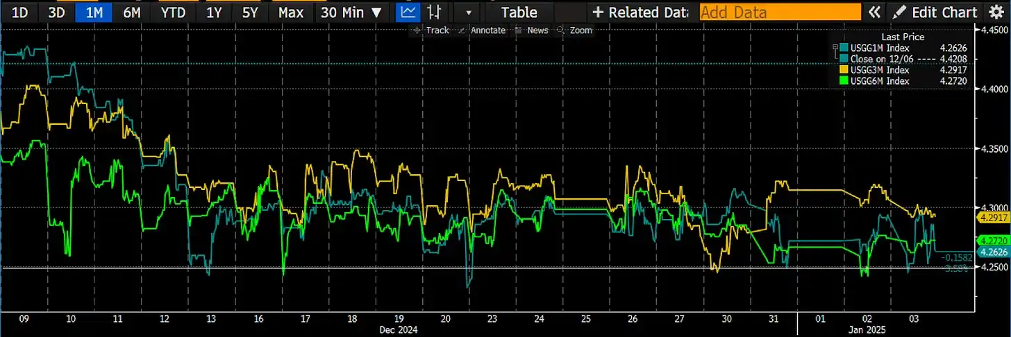 在 12 月 18 日 RRP 利率变动后,12 个月以内到期的国库券(T-bill)的收益率已超过 4.25%(白色),这是联邦基金利率下限。