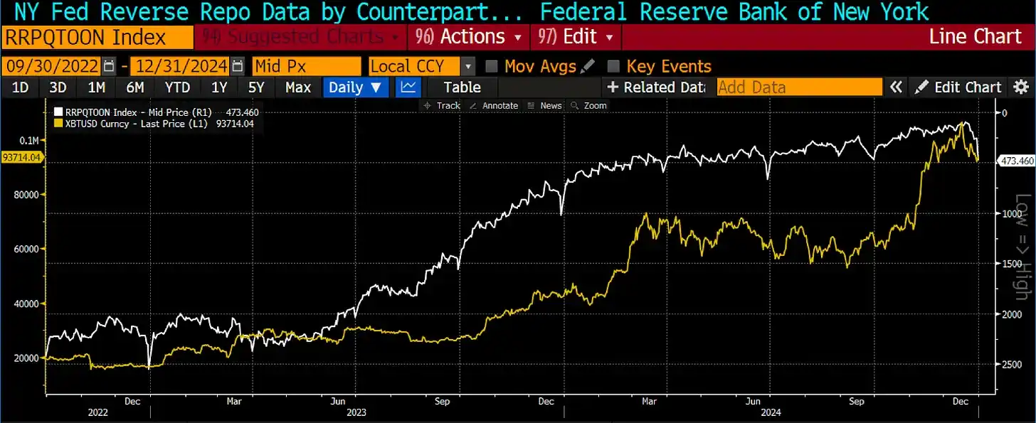 逆回购工具(RRP)已几乎降至零,为了彻底耗尽该工具的资金,美联储迟迟调整了 RRP 的政策利率。在 2024 年 12 月 18 日的会议上,美联储将 RRP 利率下调了 0.30%,比政策利率的降幅多出 0.05%。此举旨在将 RRP 利率与联邦基金利率(FFR)的下限挂钩。