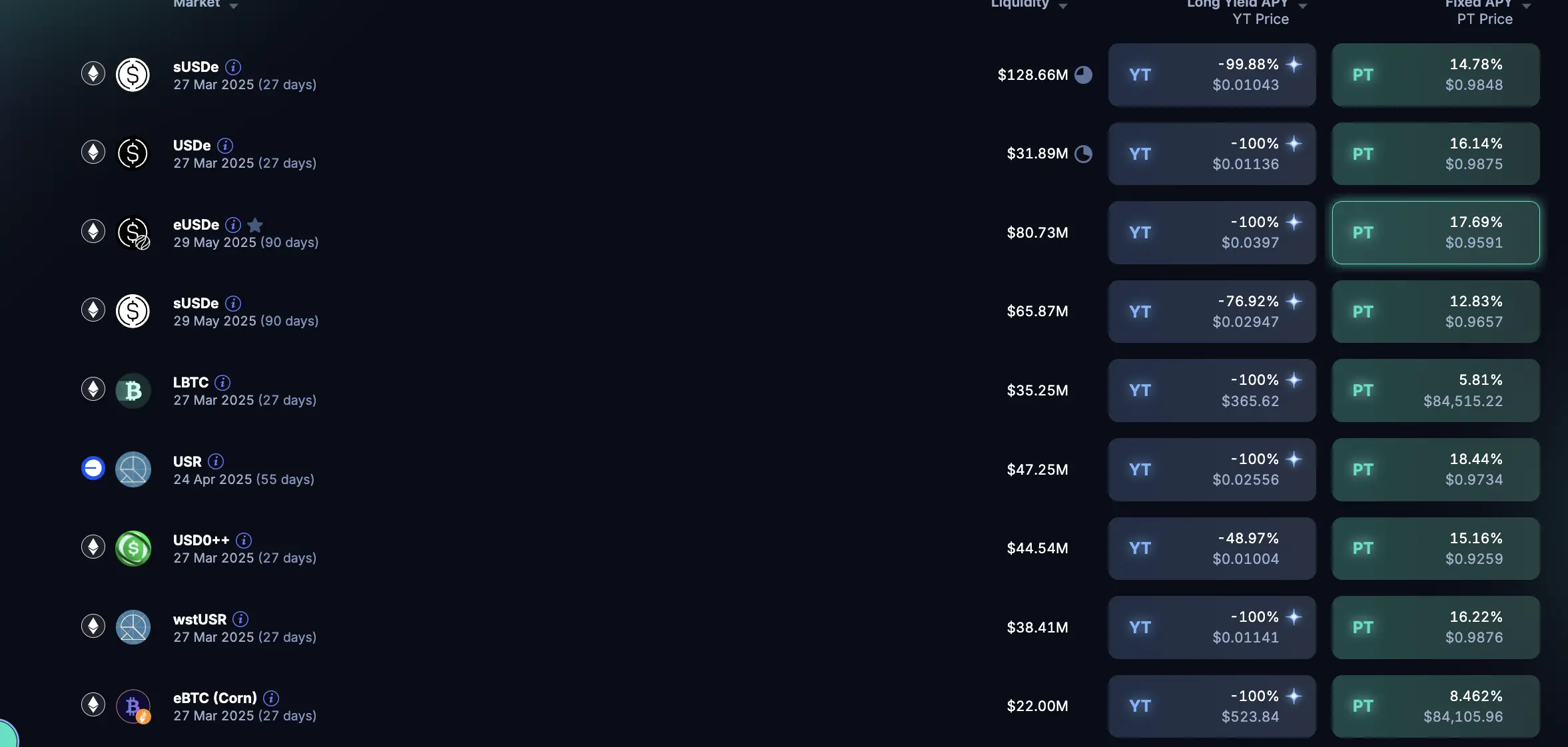 通俗来讲,相比于其他交易所主要交易的是币价,Pendle交易的对象更像是是“APY”,即“把未来的收益拿来现在玩”。它允许用户将收益生成资产拆分成“本金代币”(Principal Tokens,PT)和“收益代币”(Yield Tokens,YT),然后分别交易。比如你有 stETH(Lido 的质押 ETH),可以用 Pendle 分成 PT(到期拿回本金)和 YT(赚未来收益),然后随便买卖。这种灵活性让用户既能锁定固定收益,又能炒收益预期。