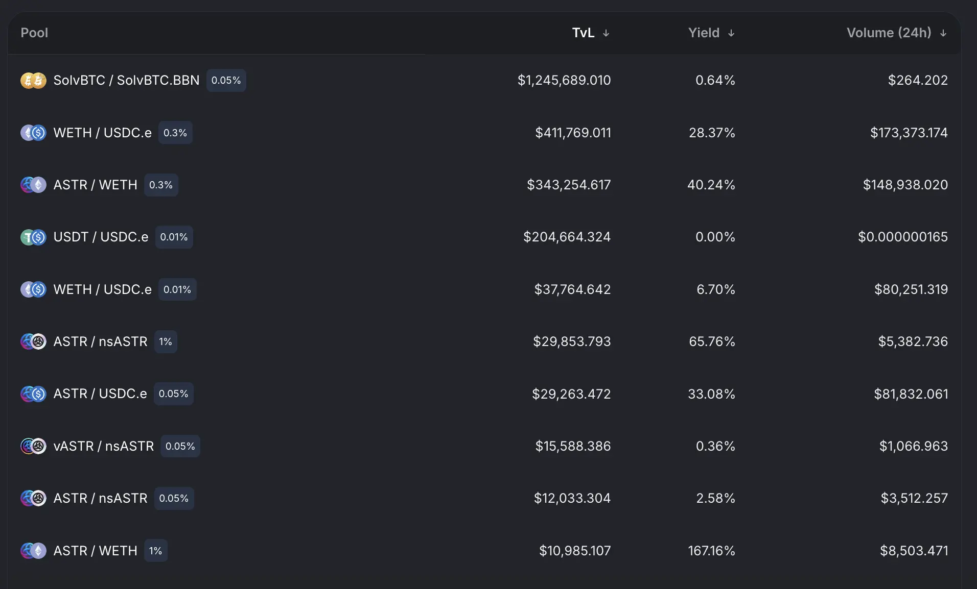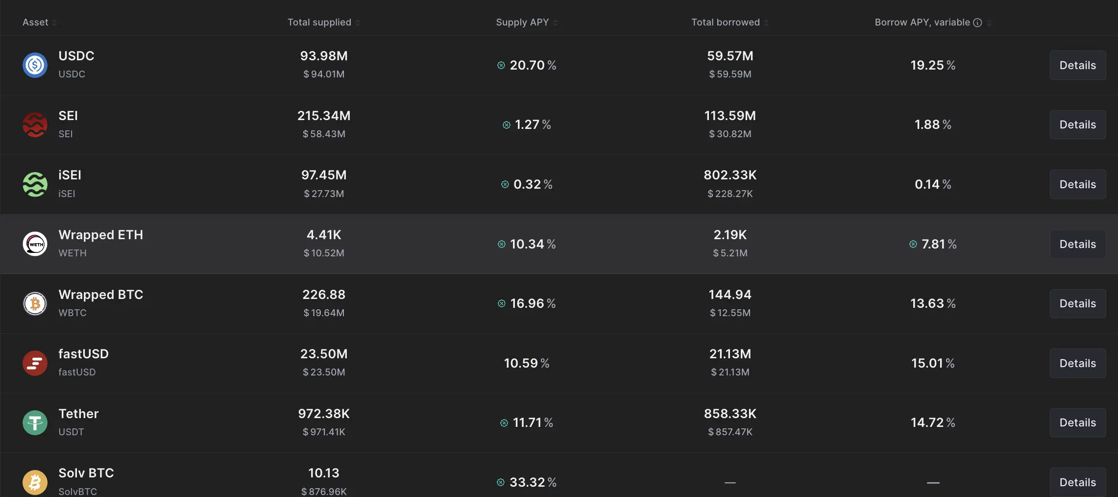 Yei 是 Sei 生态的龙头借贷协议,主打存 USDC 挖矿,还能拿 WSEI(包装过的 SEI)奖励。其定位是 Sei 的“收益聚合器”。近期,Yei 还上线了SolvBTC 池,提供比特币收益机会,这在 DeFi 中较为少见。