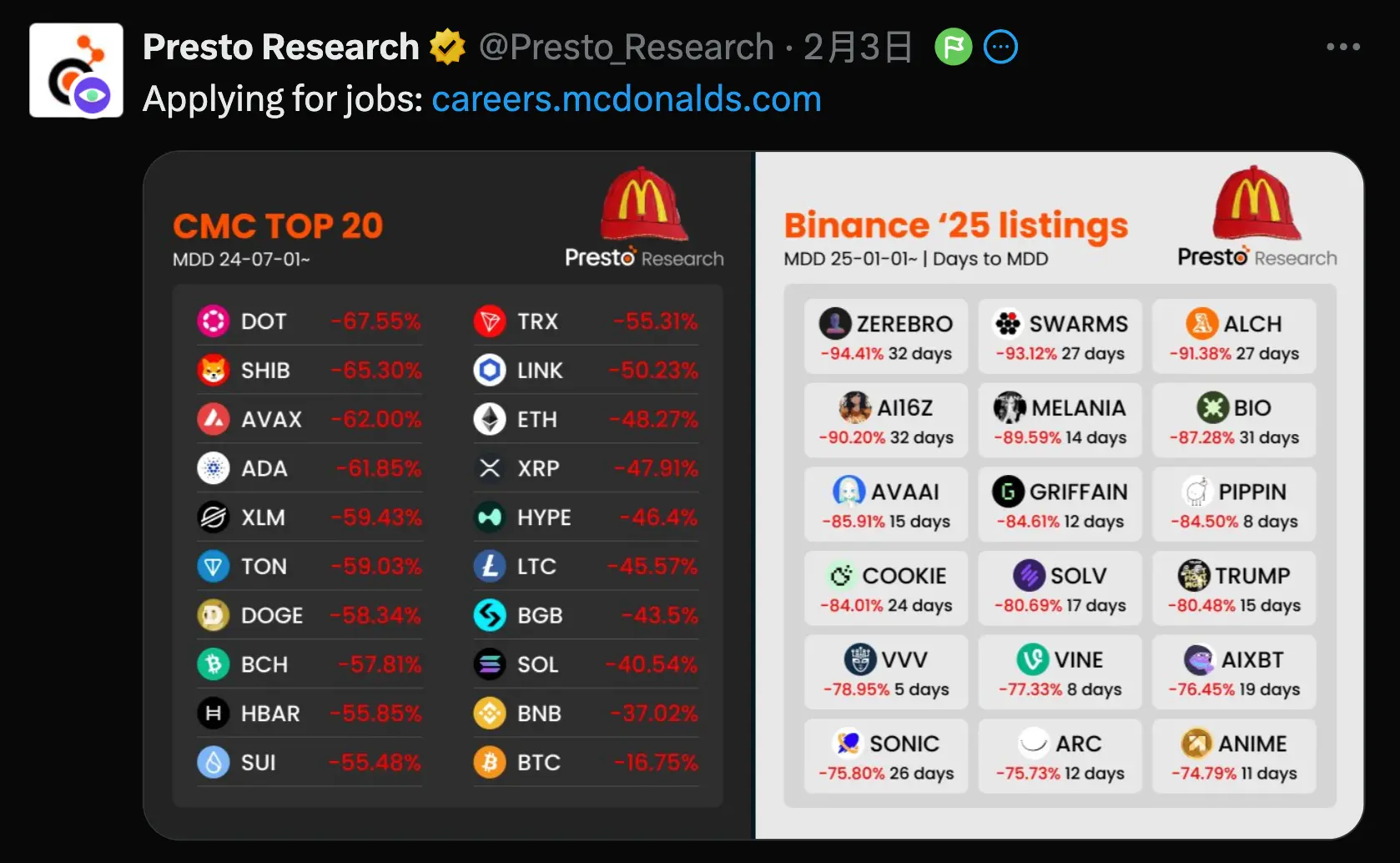 经历过上一轮牛市洗礼的玩家们可能尤为痛苦。币安等上一轮财富神话制造地,沦为项目方土狗币大户倾销地,所谓的alpha上所即巅峰。Presto Research统计了2025年第一个月币安上线的代币,100%都下跌超过70%。