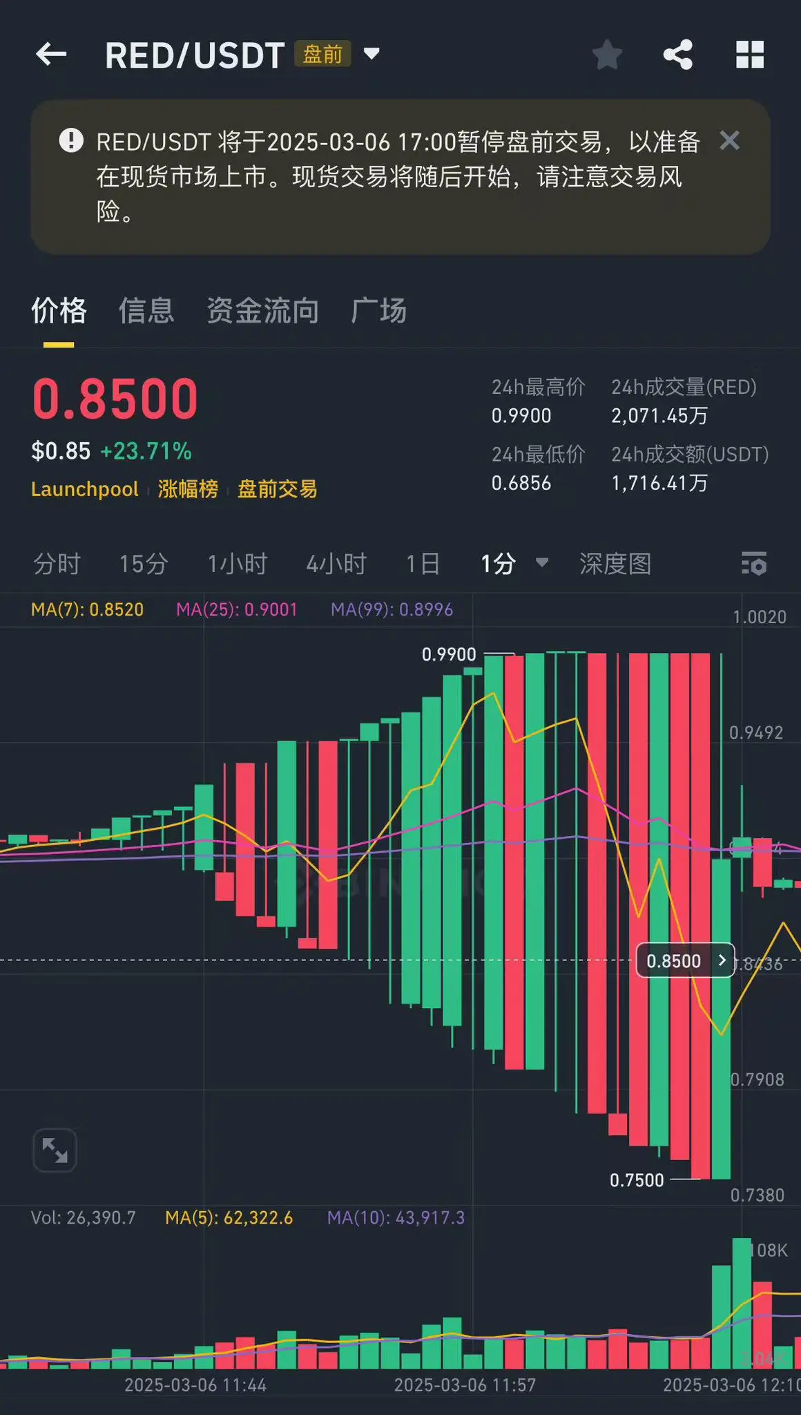 3月6日下午,Binance RED/USDT 盘前市场在当日 11:44-12:09 UTC+8 之间一度出现高达 30% 的价差振幅。