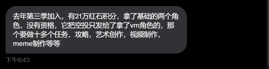 在长达数年的项目建设过程中,许多用户完成了数百个任务,包括节假日的特别任务,官方也曾多次强调“做任务积累积分,未来或有空投”。然而,在最终公布空投规则时,额外增加了一个“特殊角色”作为领取资格的条件,而这一要求此前并未有明确说明。