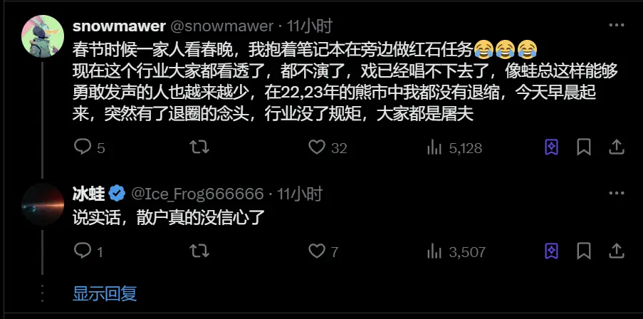 社区成员@snowmawer表示,自己“春节时候一家人看春晚,还抱着笔记本在旁边做红石任务”。但最后他依然没有获得空投份额。