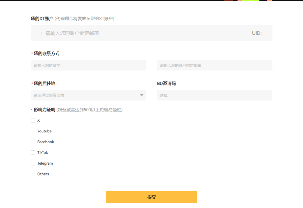 内容创作者、影响者和加密爱好者只需前往加入XT合伙人计划网站填写基本资料,即可轻松加入 XT 合伙人计划并开始赚取收入。拥有 500 名以上追随者的申请者更容易通过审核。