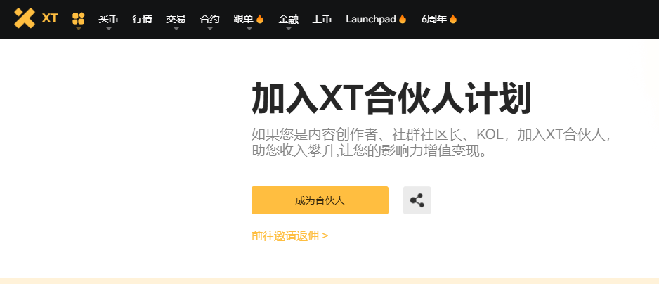 XT 合伙人计划XT.COM 的创新联盟模式,旨在帮助内容创作者、影响者和社群领袖通过推广优质的加密交易平台来获取收入。该计划提供丰厚的佣金、终身返佣机制以及每日结算,让合伙人能够建立稳定且长期的收入来源。XT 合伙人计划 的目标不仅是提供经济回报,更是促进全球加密社群的互动,让合伙人分享 XT.COM 的先进交易方案,并协助更多人探索数位资产的潜力。