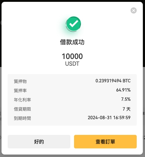 选择您偏好的借款期限、借款币种和数量以及质押币种和数量(质押物来自用户现货账户)。请仔细检查借款详情,如年化利率、初始质押率、预警质押率和强平质押率。确认信息无误后,点击「确定借款」提交借款申请。确认后,您的质押物将转入系统质押账户保管。