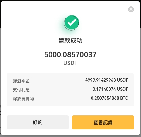 点击「还款」进入还款页面,输入还款金额,您可以选择部分还款或全额还款。同时可以选择是否按比例释放质押物,若勾选按比例释放质押物,则质押物会按还款比例等比例释放。若选择全额还款,则质押物也将全额释放。还款金额将从用户现货账户扣除,质押物也将释放到现货账户。