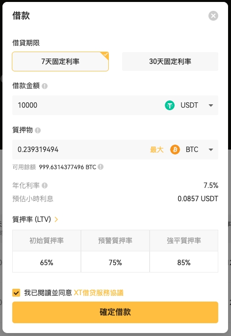 以 XT 的质押借贷为例,XT 是加密货币借贷领域的领军者,主要提供 7 天或 30 天固定期限的贷款。贷款批准后,XT 将资金直接转入现货账户,无需支付额外的交易费用,便可轻松提现。平台维持固定利率,按小时计息,确保借款过程中的透明性与可预测性。