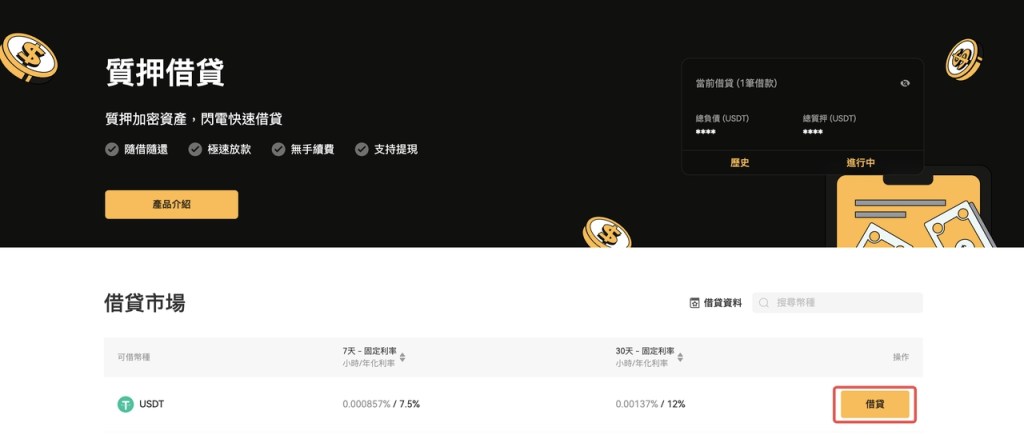 从质押借币首页的资产列表中选择您想要借款的资产,然后点击「借款」。