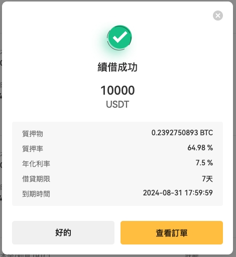 在借款到期前24小时开始,您可以选择进行续借操作。点击「续借」进入续借页面,选择借款期限,确认借款金额和质押数量(与当前订单保持一致,不可修改),以及年化利率和质押率。请注意续借前需先付清当前订单的利息欠款。点击「确认支付并续借」后续借成功,原订单支付剩馀利息后关闭,同时生成一笔新的借款订单。