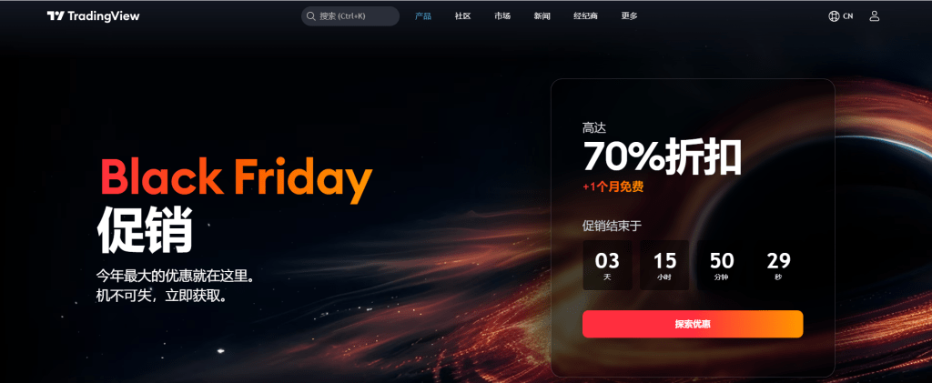 今年黑色星期五,TradingView 为交易者带来了全年最重磅的优惠!作为全球领先的市场分析平台,TradingView 提供高达 70% 的订阅折扣不管是现货交易,杠杆交易,合约交易等,选择年费订阅的用户还可额外享受为期 1 个月的免费使用期。同时,通过推荐链接注册的新用户,可领取 15 美元奖励金,以更低成本畅享专业级交易工具。