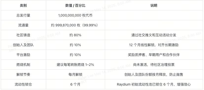 • – 流动性锁仓:Raydium 上的初始流动性池已锁仓 6 个月,增强用户对流动性的信任。