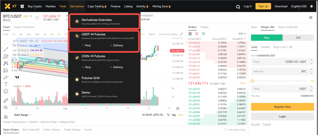 XT.COM交易平台BTC/USDT合约交易界面及衍生品概览