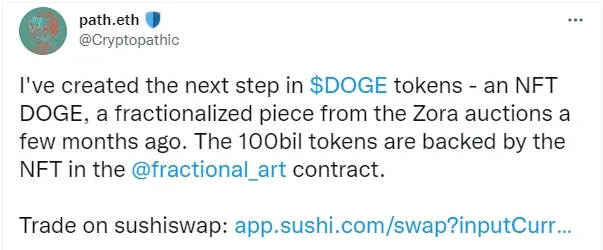 Feisty Doge照片是与名为Kabosu的日本柴犬拍摄的一部分,Kabosu作为Doge Meme背后的狗狗而在互联网上声名鹊起。该照片在6月份作为NFT出售,由推特名为path.eth(@Cryptopathic)的用户在去中心化拍卖平台Zora,以13枚ETH的价格竞拍得来。8月19日,该名用户将这张Feisty Doge NFT(狗狗币头像原型)所有权进行分割,并创建了代币NFD,总量为1000亿份。随后他在SushiSwap上创建了一个ETH-NFD的池子,投入25枚ETH和50亿NFD作为初始流动性,这意味着Feisty Doge的初始估值为500枚ETH(当时价值约155.5万美元)。