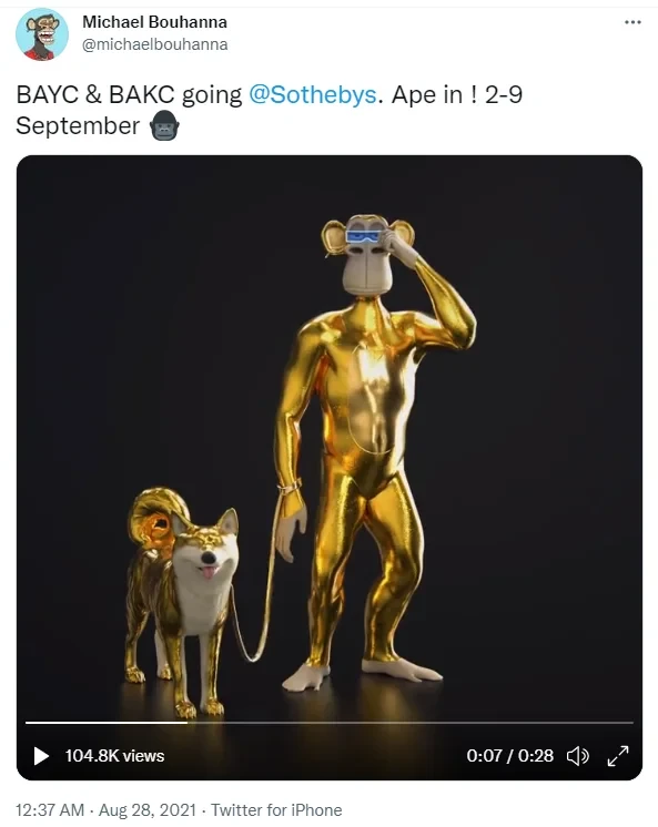 有消息指出,苏富比副总监、当代艺术专家及数字艺术联席主管Michael Bouhanna在8月28日发推称, BAYC与BAKC将于9月2日至9日亮相苏富比。