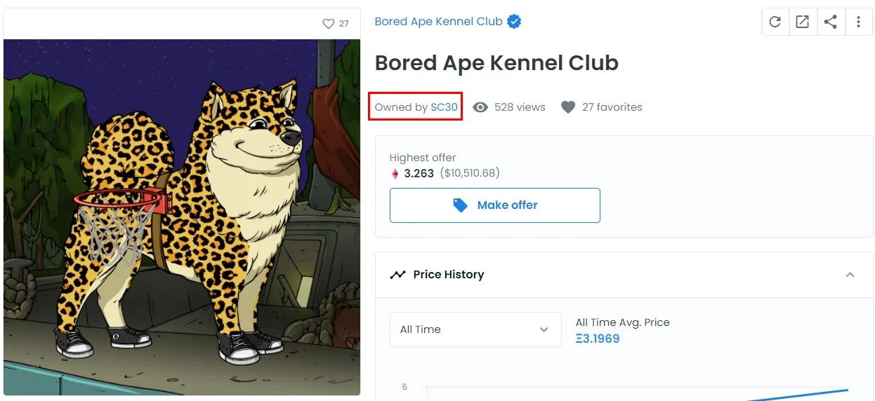 除了买入BAYC猿猴外,他还以5.7枚ETH(约合1.8万美元)的价格购买了Bored Ape Kennel Club NFT(BAKC)——一只绑着篮球框的豹纹狗狗。