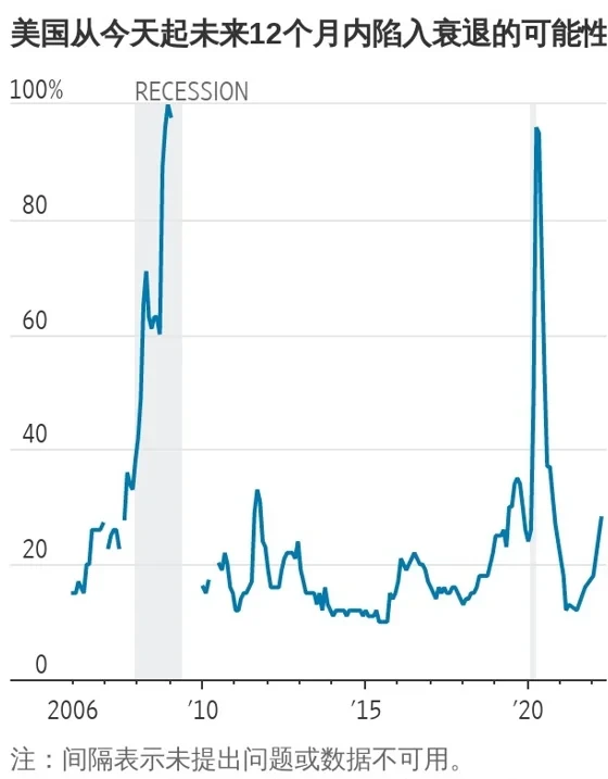 首先是,本月初《华尔街日报》对65位商业、学术和金融人士进行了调查,受访对象普遍预计美国经济在未来一年陷入衰退的概率为28%,均高于年初的18%和一年前的13%。换言之,精英层面进一步调低了对美国经济的预期,悲观情绪日渐浓厚,主流观点对于美国经济衰退,达成了进一步的共识。