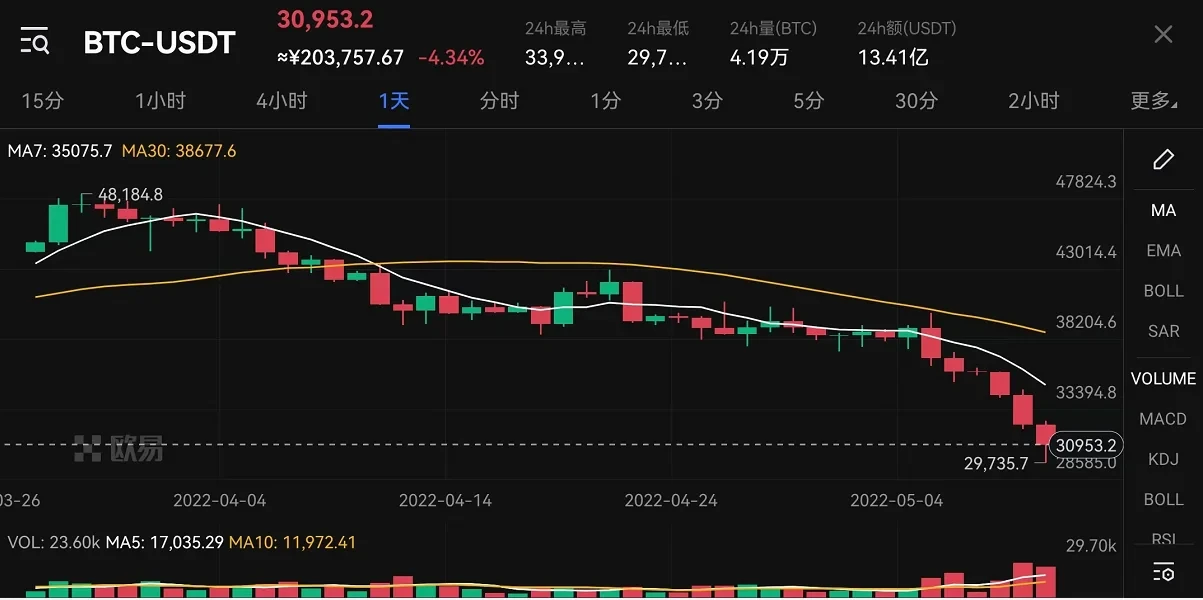 据欧易行情数据显示,北京时间5月10日早上8点左右,比特币短时跌破3万美元关键位置,最低至29735美元,24小时内跌幅逾10%。这是自去年11月10日,比特币登顶6.9万美元最高点后,首次跌破3万美元。半个小时后,比特币价格又重回3万美元以上的位置。10点整,比特币价格暂报30891美元。