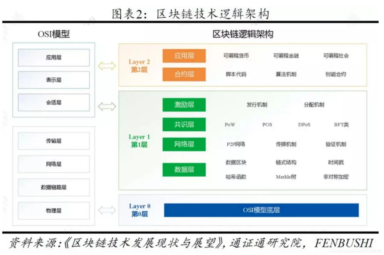 其中的Layer就是它的最普遍释义——“层”的意思,所谓Layer1和Layer2也就是第一层和第二层。对照上图来看,其中第0层对应OSI模型的底层协议,大致包括物理层、数据链路层、网络层和传输层。第一层(Layer 1)大致包括数据层、共识层和激励层。而第2层(Layer 2)则主要包括合约层和应用层。