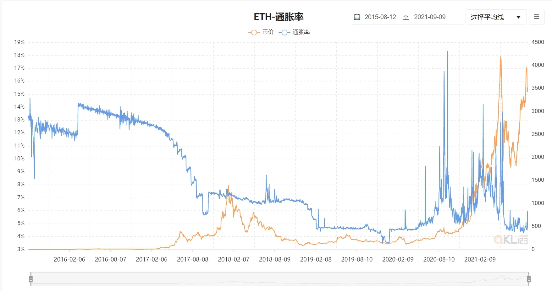 据ETH Burn Bot统计,9月3日当天,以太坊网络共销毁13838.3枚ETH,而产出的区块奖励为13485.5枚,销毁量首次超过发行量,净销毁量为352.8枚,年化通胀率为-0.11%。而如果将周期拉长来看,近期以太坊网络的通胀率也是处于2020年1月以来的低水平阶段,如果从2020年9月17日记录到的18.35%历史最高通胀率计算,到目前(约为4.65%)为止,以太坊的通胀率已经下降了75%左右。