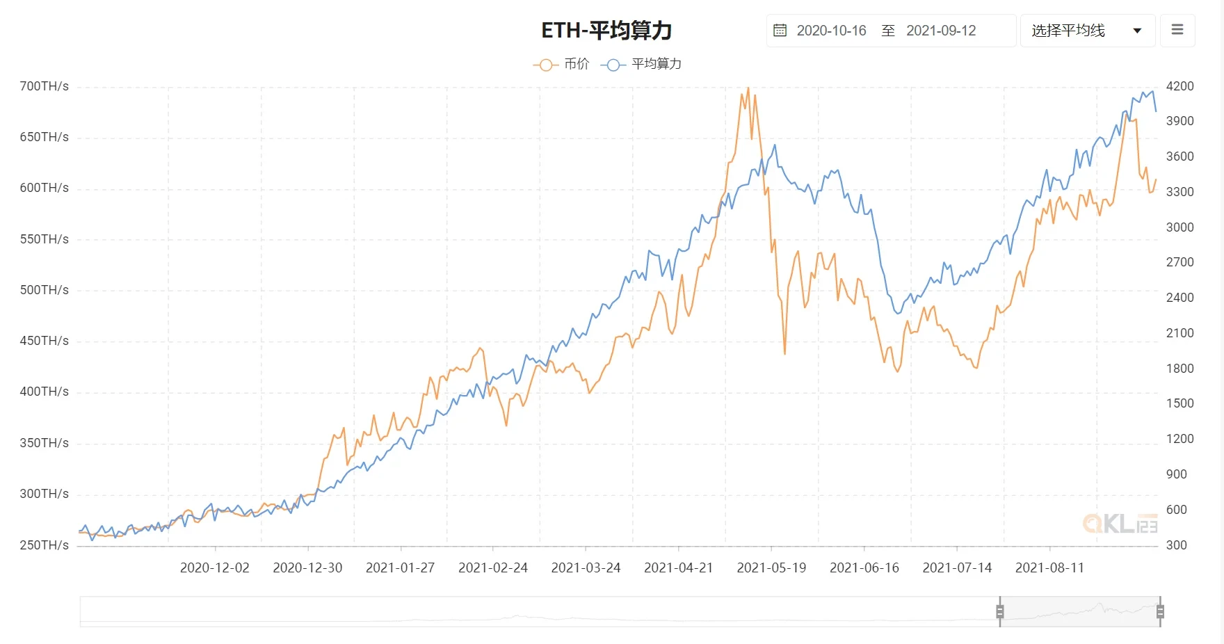 而如果将一周内以太坊网络算力的变化和ETH价格的波动对比来看,还能够发现这样一个现象:虽然在9月7日的时候,ETH价格出现超过20%的波动,但是其网络算力却不降反增;昨日小有回落,不过和价格的跌幅相比,依然要小得多,这也从侧面可以说明这一轮由NFT板块爆发带来的行情热度以及Gas费飙升的情况尚未出现明显的退潮迹象。