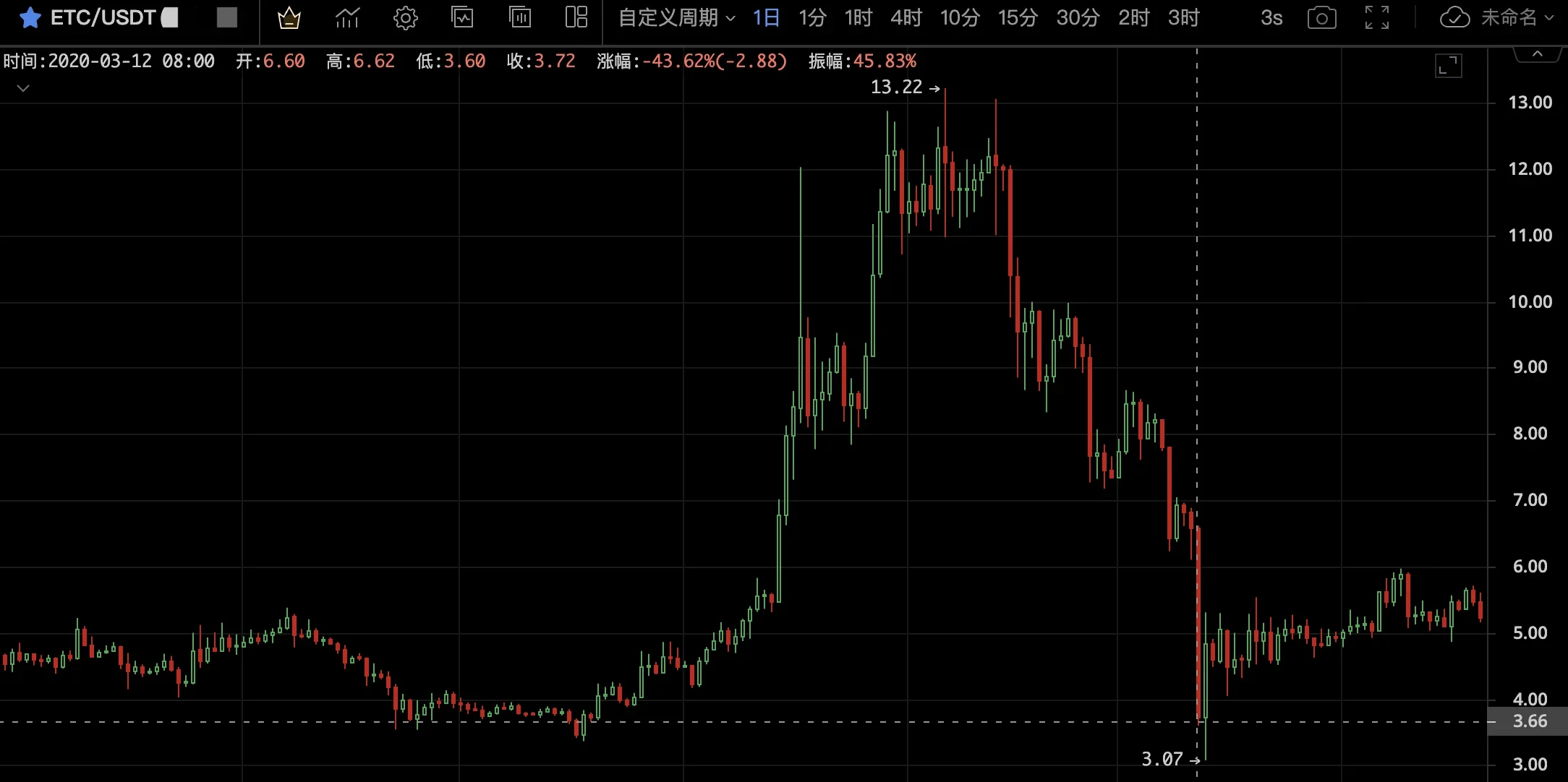 此后,在2020年3月17日,ETC网络将开始减产,在此之前的一个多月内,ETC币价从3.4USDT上涨至最高13.2USDT,涨幅接近300%。而在3月12日,加密市场经历了惨烈的“312”踩踏事件。